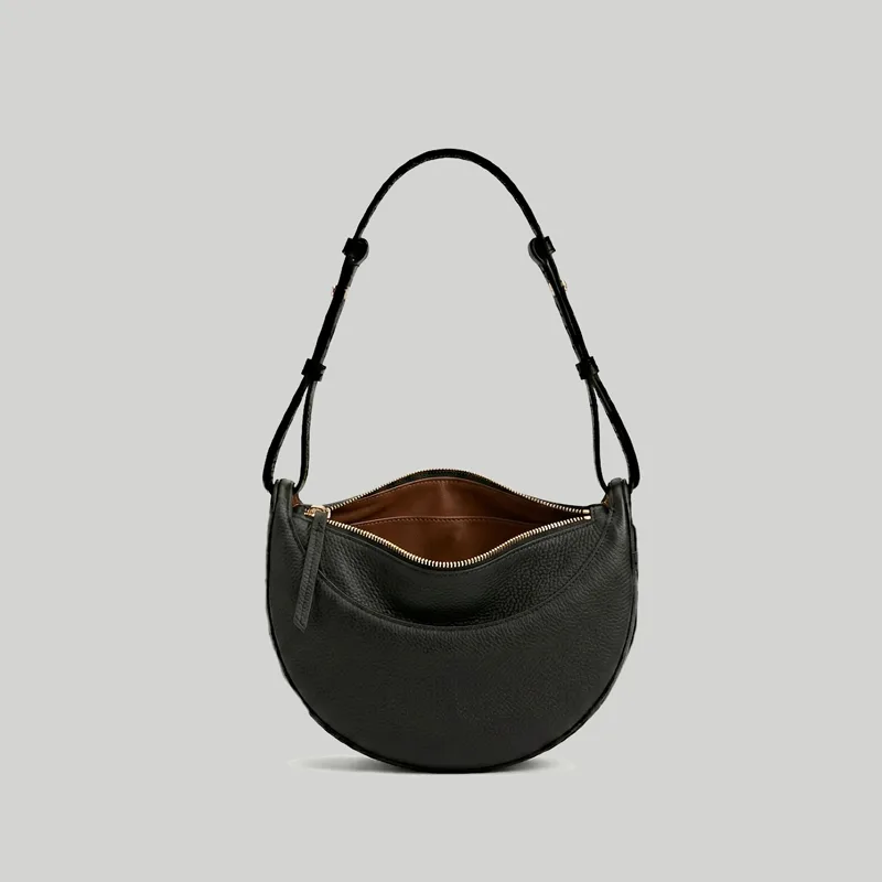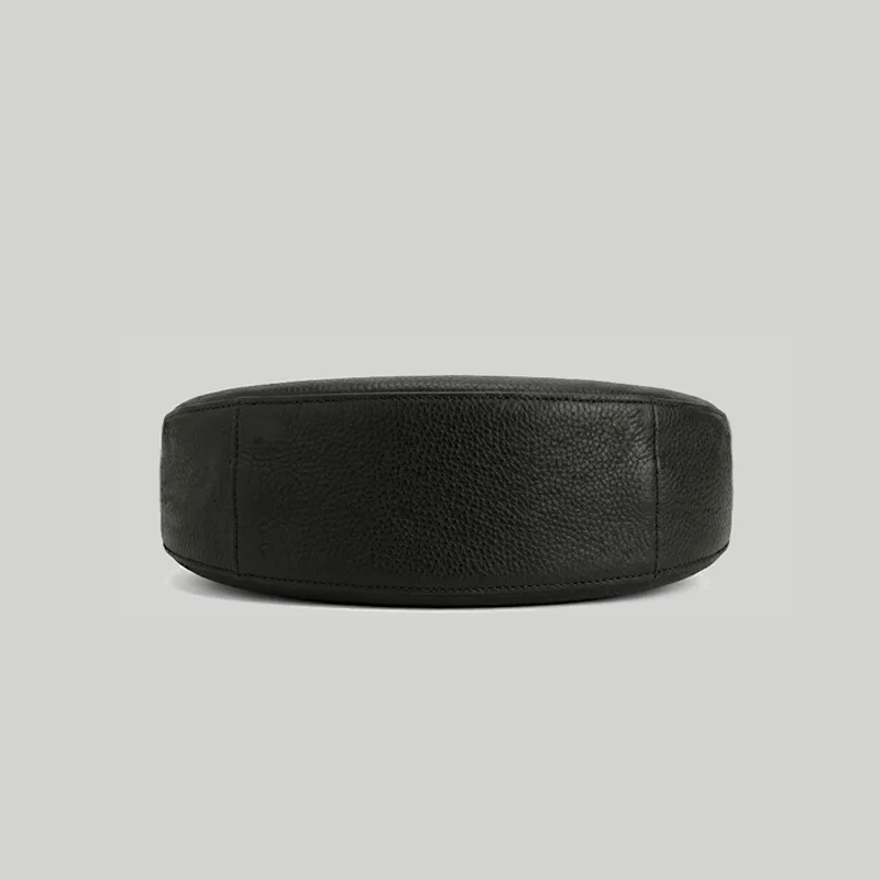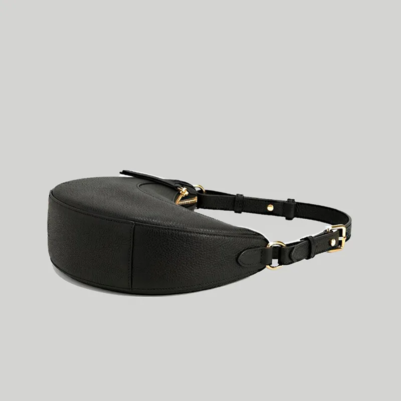 “The LT-SH-S61 is a minimalist crescent shoulder bag crafted from premium textured pebbled leather with polished gold-tone hardware. Featuring a classic half-moon silhouette, an adjustable strap, and a 7.5 cm widened gusset base, it offers both “quiet luxury” aesthetics and practical daily capacity. The interior opens to a sophisticated brown contrast lining. Full OEM, ODM, and private label customization are supported for wholesale orders.”