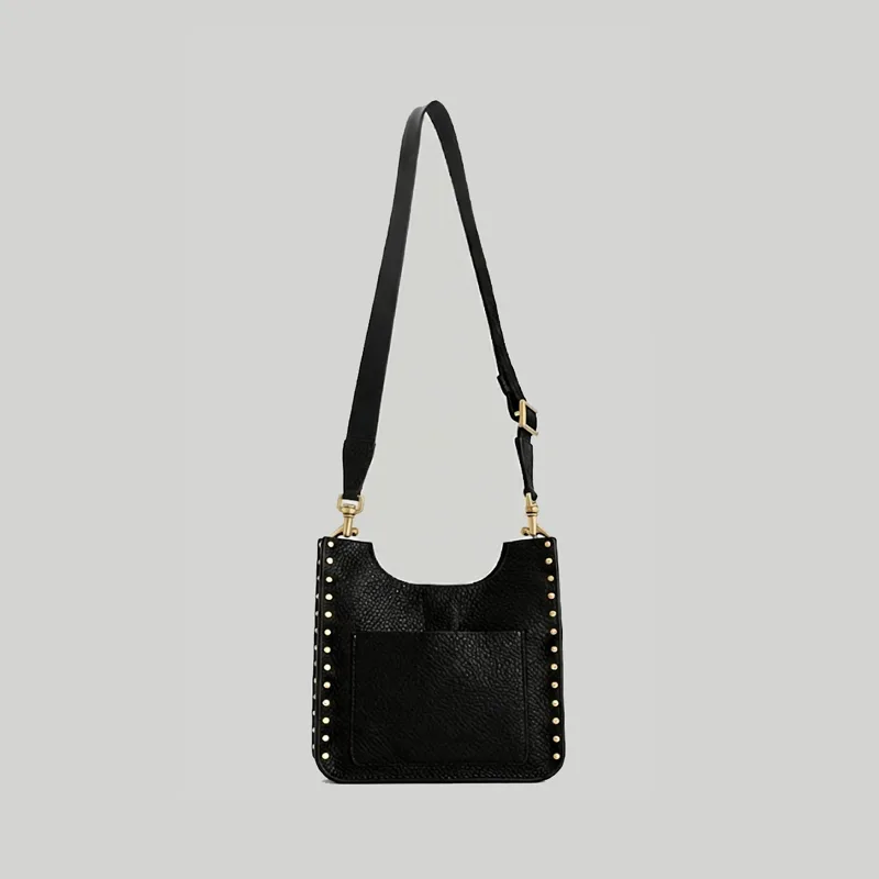 An edgy yet sophisticated everyday essential. This structured vertical crossbody bag perfectly balances modern minimalist design with rock-chic studded details and commuter-friendly functionality.