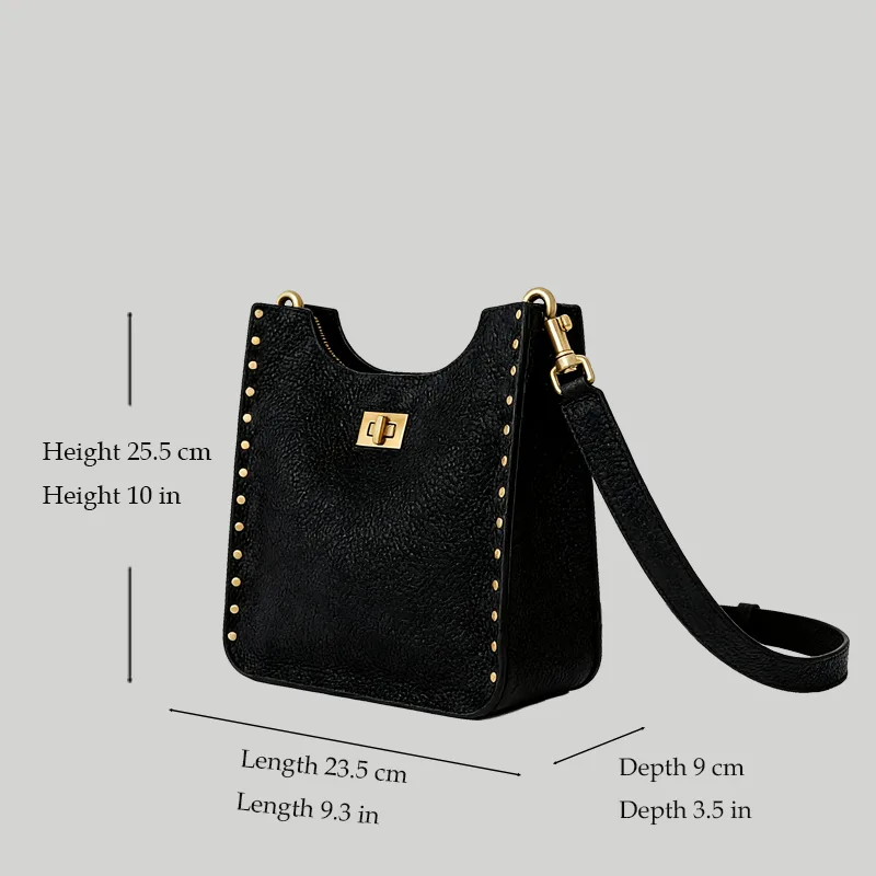 Description: LT-SH-S62 | Black Pebbled Leather Studded Crossbody Bag – U-Shaped Shoulder Purse with Gold Turn-Lock