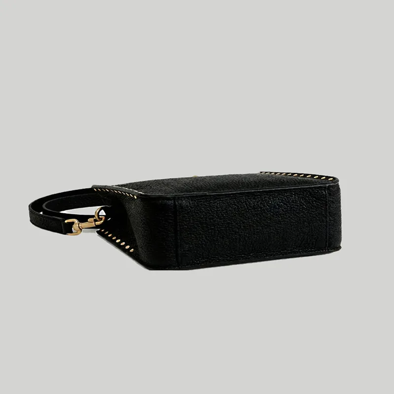 A perfect blend of edgy aesthetics and commuter functionality. This structured vertical crossbody bag is crafted from durable black pebbled leather, highlighted by striking gold-tone studs and a signature U-shaped top.