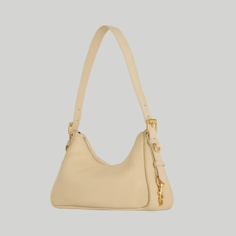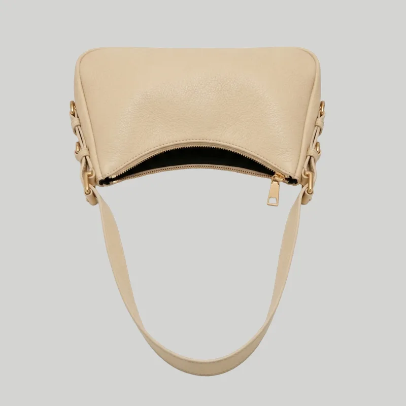 Minimalist beige leather shoulder bag featuring a structured crescent silhouette, adjustable strap, and vintage-style gold-tone hardware. Premium B2B wholesale & OEM available.