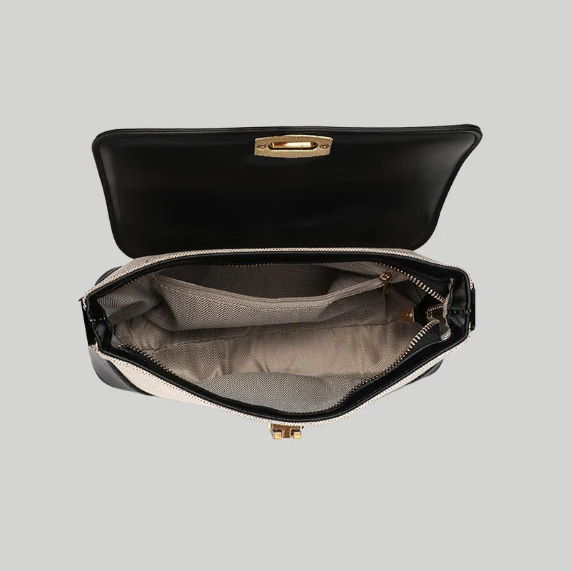 Design: Features a structured baguette silhouette and a fold-over front flap secured by an interlocking metal closure, complemented by an adjustable flat shoulder strap.