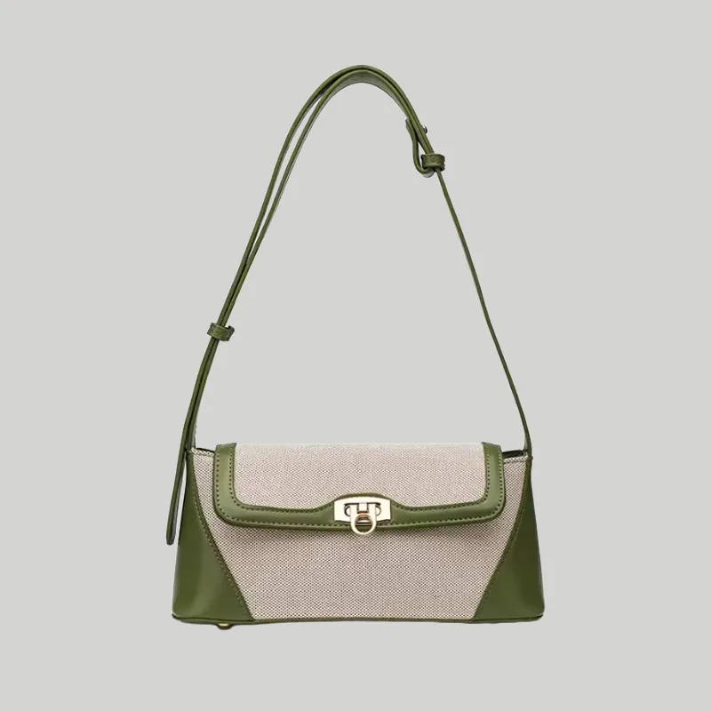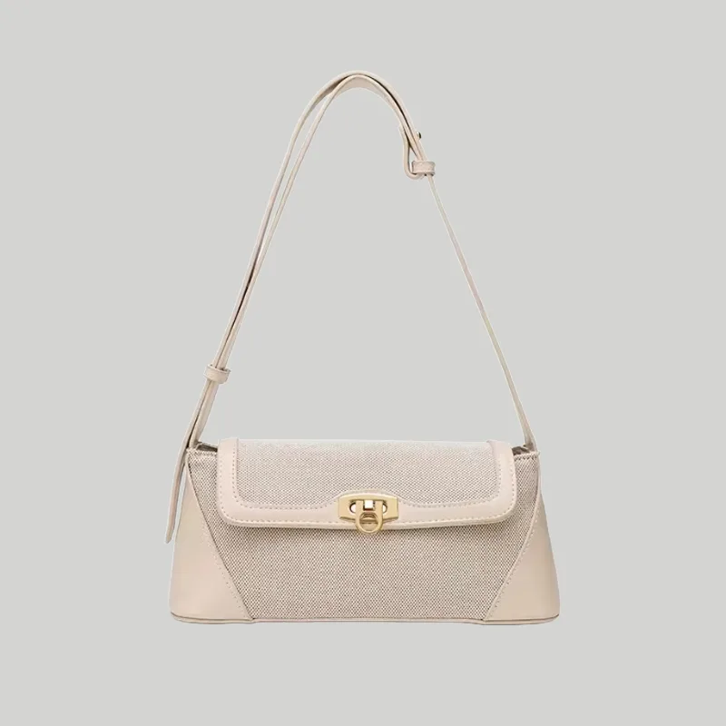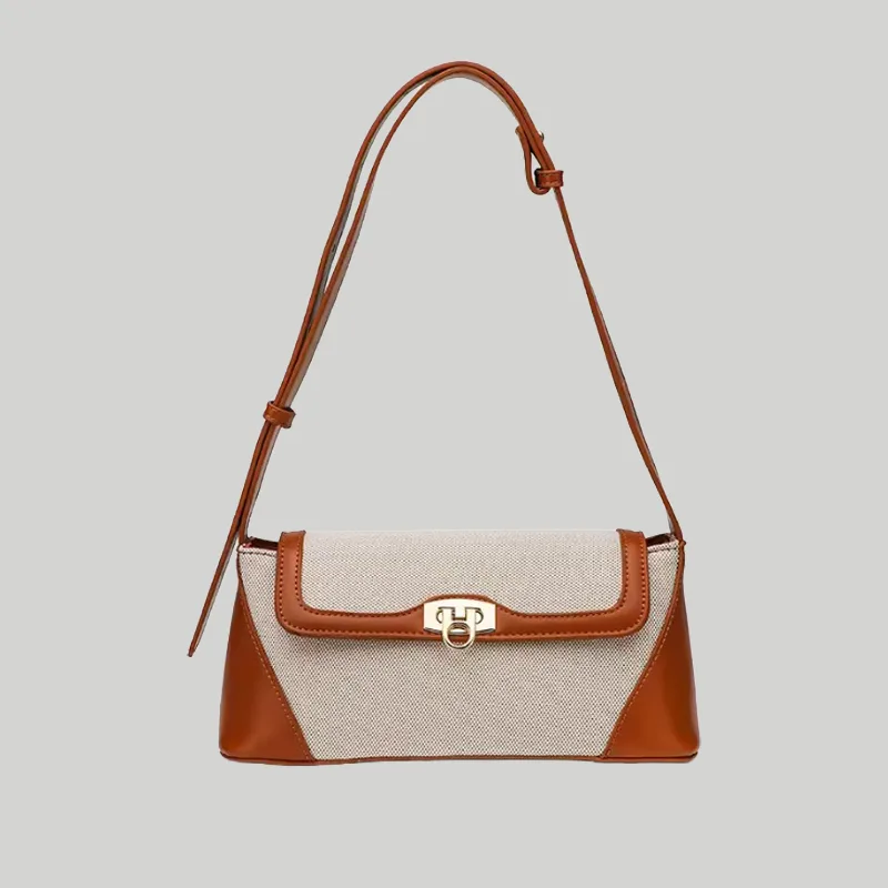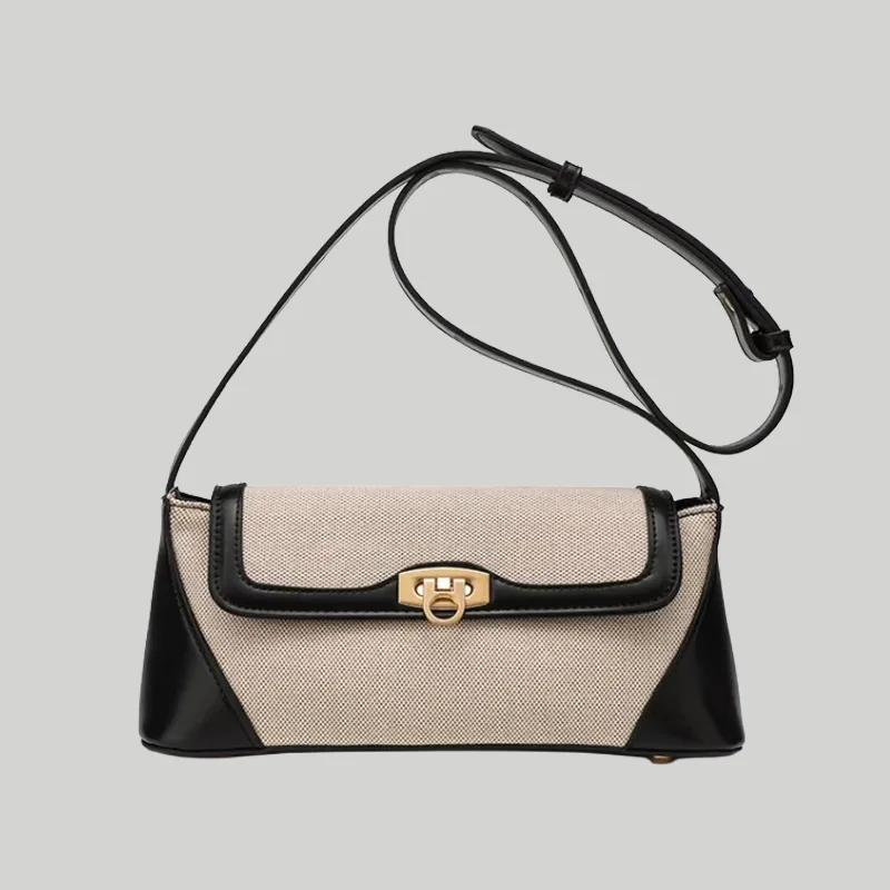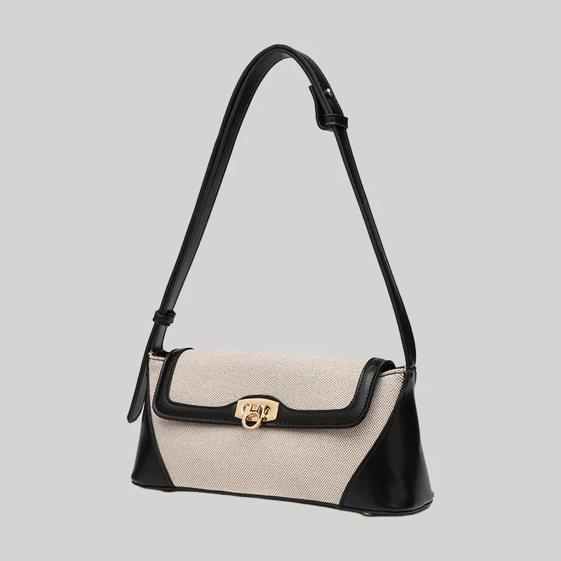 Meta Description: Structured two-tone shoulder bag featuring woven canvas, smooth contrast trim, and secure metal hardware. Premium B2B wholesale & OEM available.
